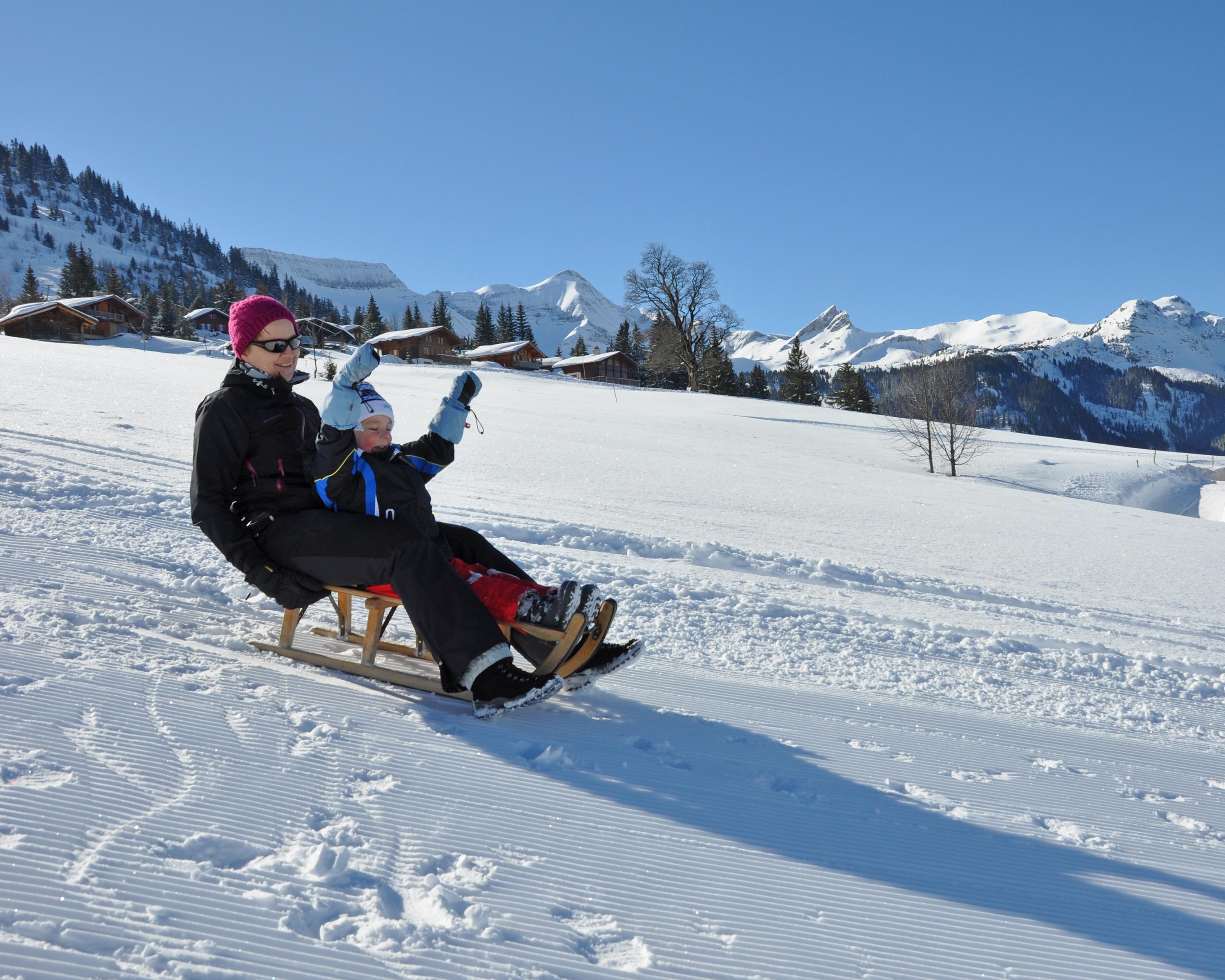 Rasantes Schlitteln unter dem Axalphorn und dem Tschingel. Ein familiäres Schlittelvergnügen mit einem atemberaubenden Blick auf den schönen Brienzersee.