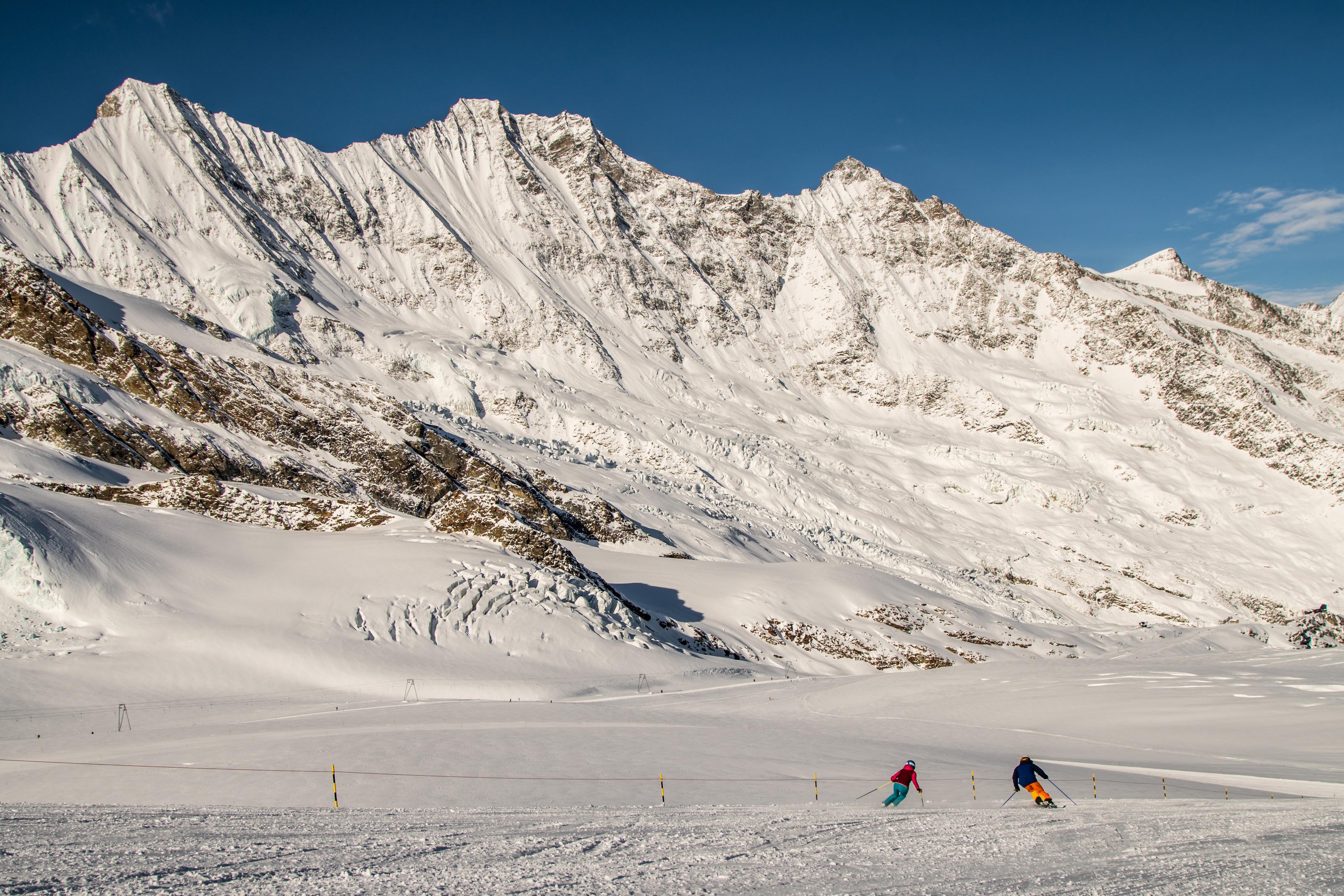Die Gletscher sind in Saas-Fee nicht nur zum Greifen nah. Der obere Teil des Skigebiets liegt sogar tatsächlich auf Gletschergrund. Für die abwechslungsreiche Talabfahrt ins Dorf stehen zwei Varianten zur Auswahl. Technisch anspruchsvoller ist die Strecke über Längfluh. Versierten Fahrern bietet aber auch die Abfahrt über Morenia einige knackige Herausforderungen, etwa den Gletscherschuss oder das Alte Kanonenrohr. Weniger geübte Fahrer umgehen diese Passagen auf blau markierten Abschnitten.