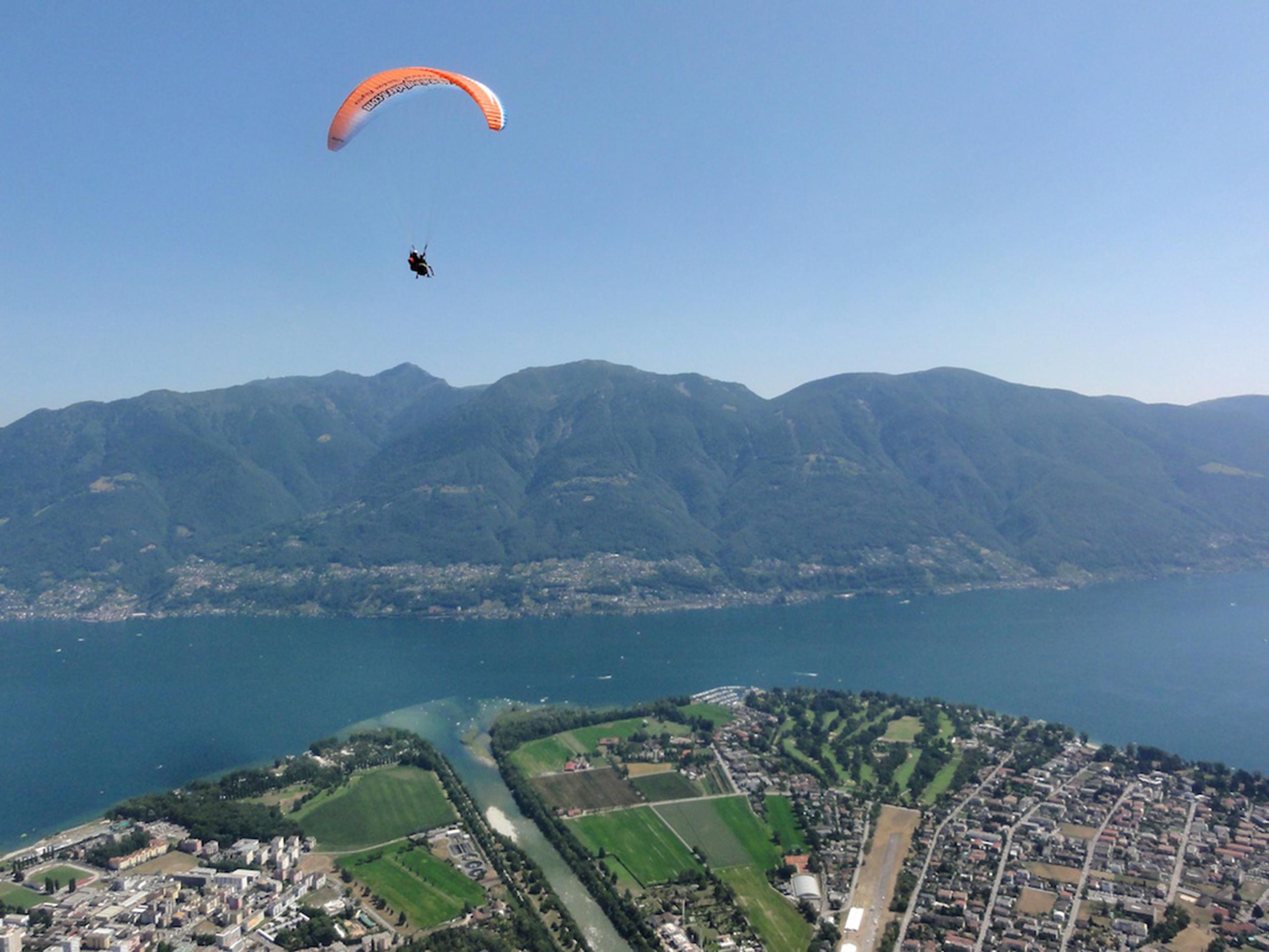 Bei einem Tandem-Gleitschirmflug schweben Gäste hoch in den Lüften über Locarno.