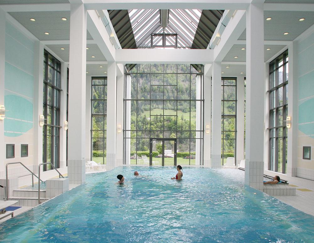 Thanks to the development of the rheumatology and rehabilitation clinic, Valens/Vasön has grown into a thriving holiday and health resort. The spa hotel, the clinics and the thermal pool are under one roof. The water, originating in the Tamina Gorge, feeds the pools. The thermal water has a temperature of 36.5°C as it rises to the surface. The Thermal Spa includes an indoor pool (34°C) with bubble beds, and massage jets, as well as neck jets. A small steam bath, a sauna and solarium complete the offerings.