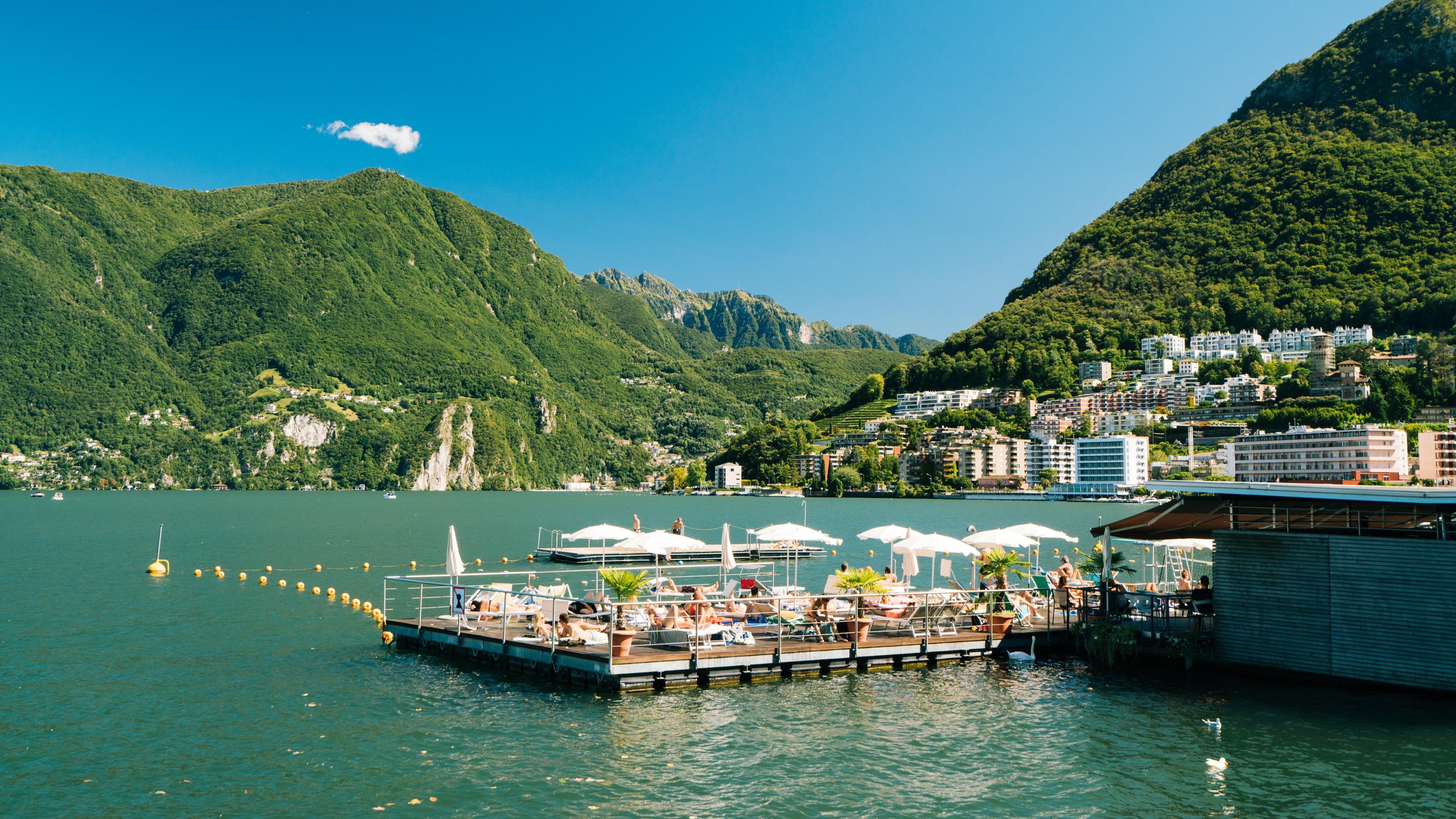 Vicino al centro della città, davanti al Museo d’Arte, sorge il Lido Riva Caccia con una zattera che dondola dolcemente sull’acqua come una barca.