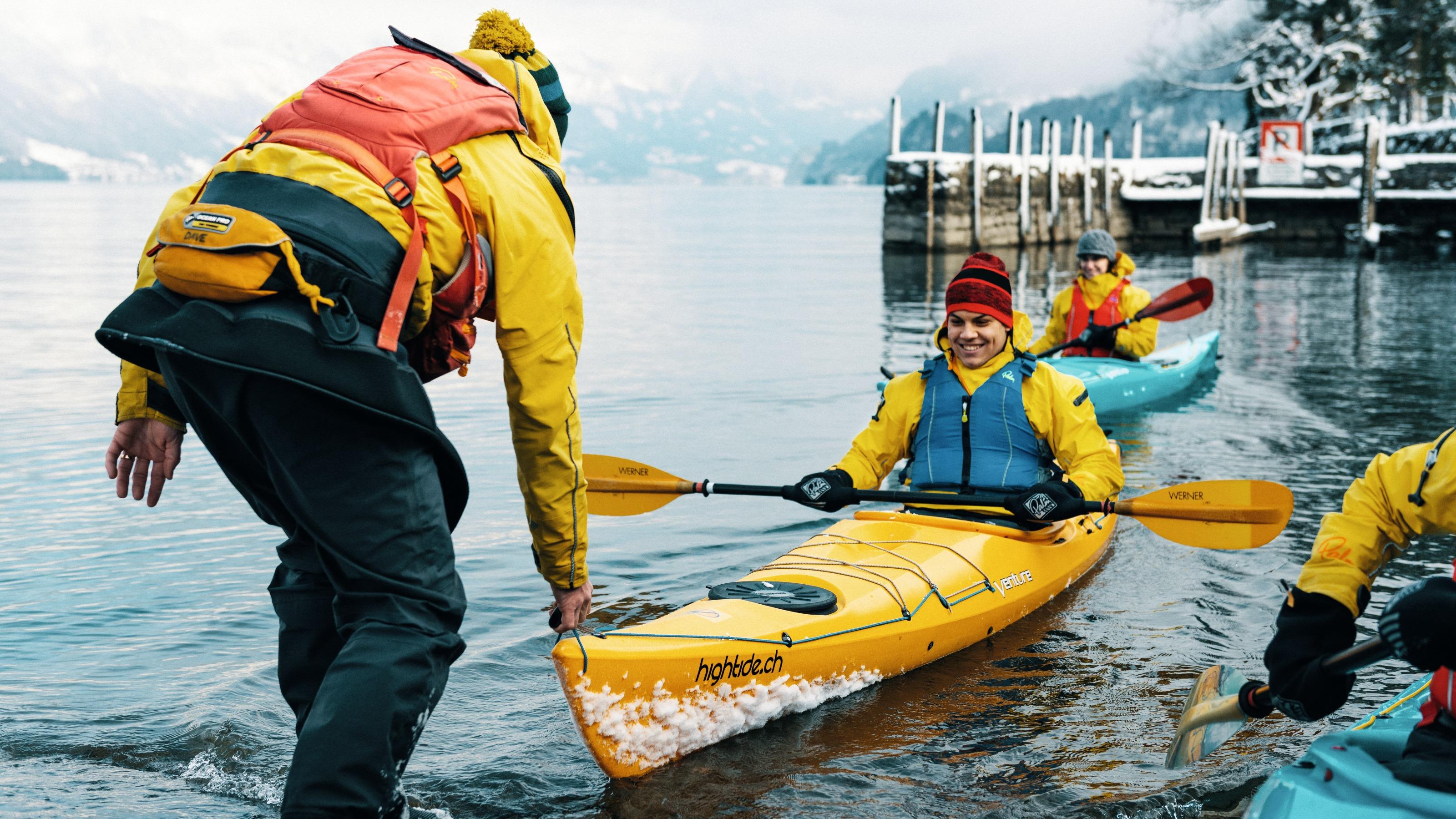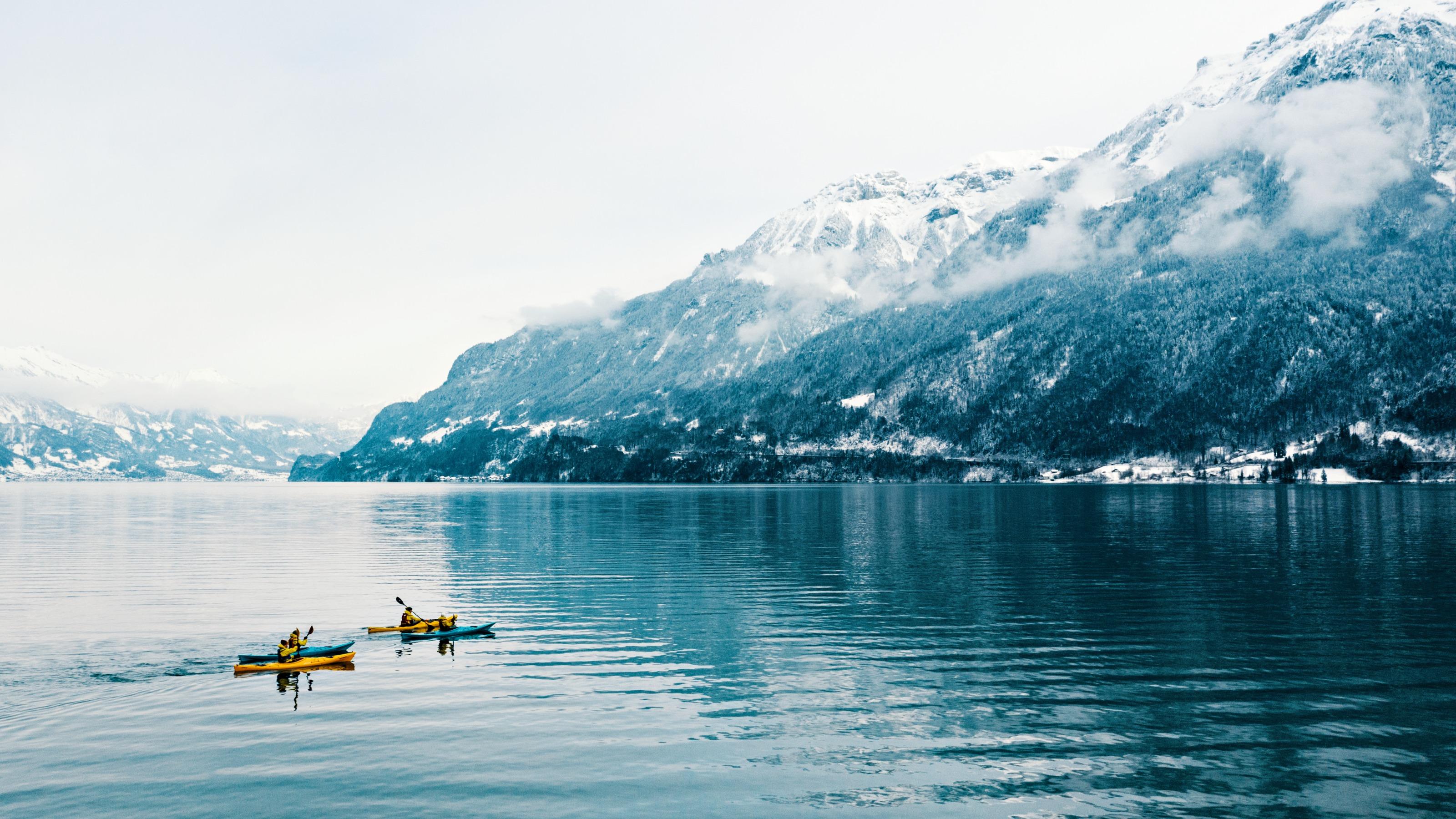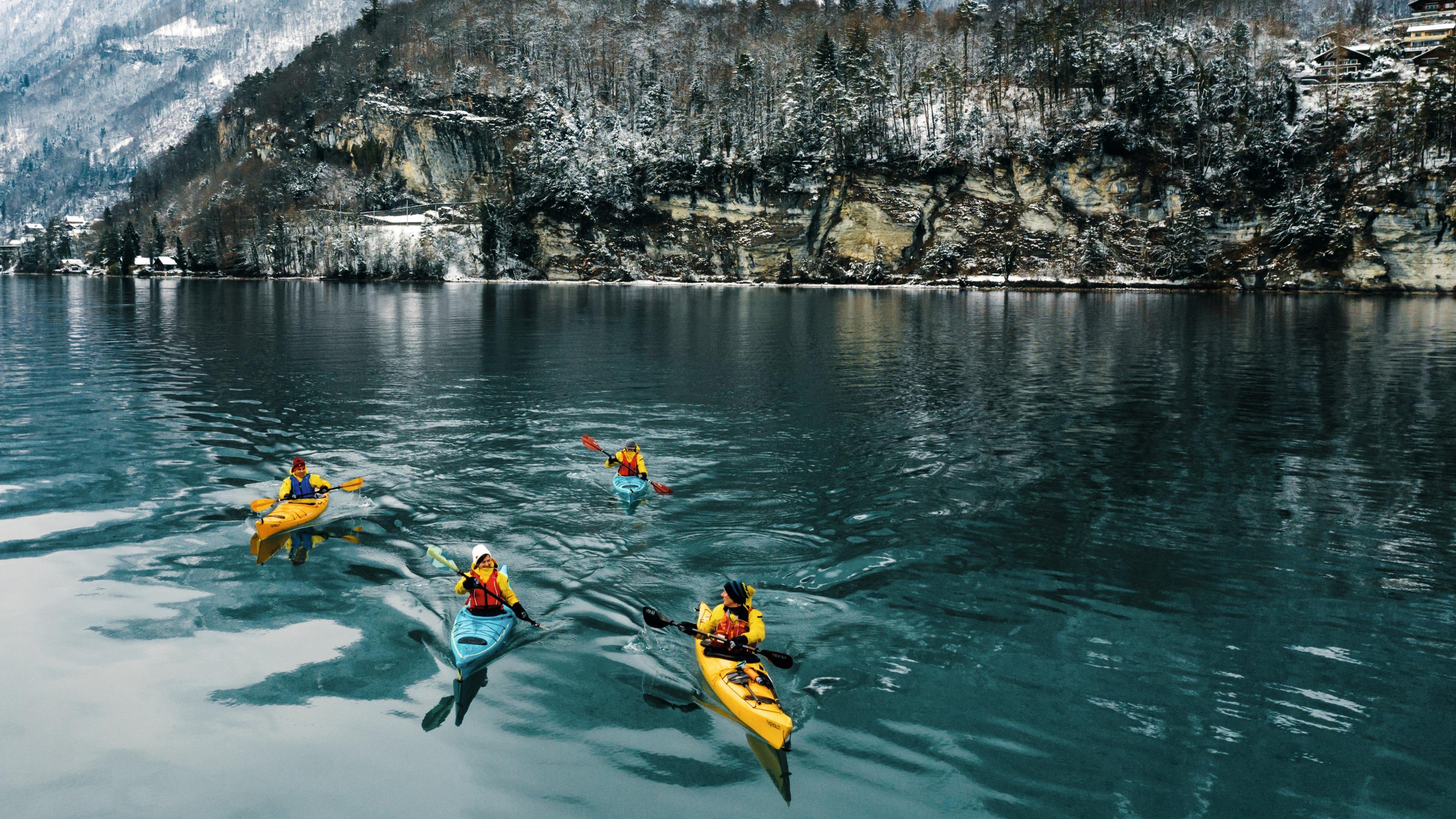 Andare in kajak d’inverno? Perché no? Un tour in kayak sul lago di Brienz permette di ammirare il paesaggio invernale da una prospettiva unica.