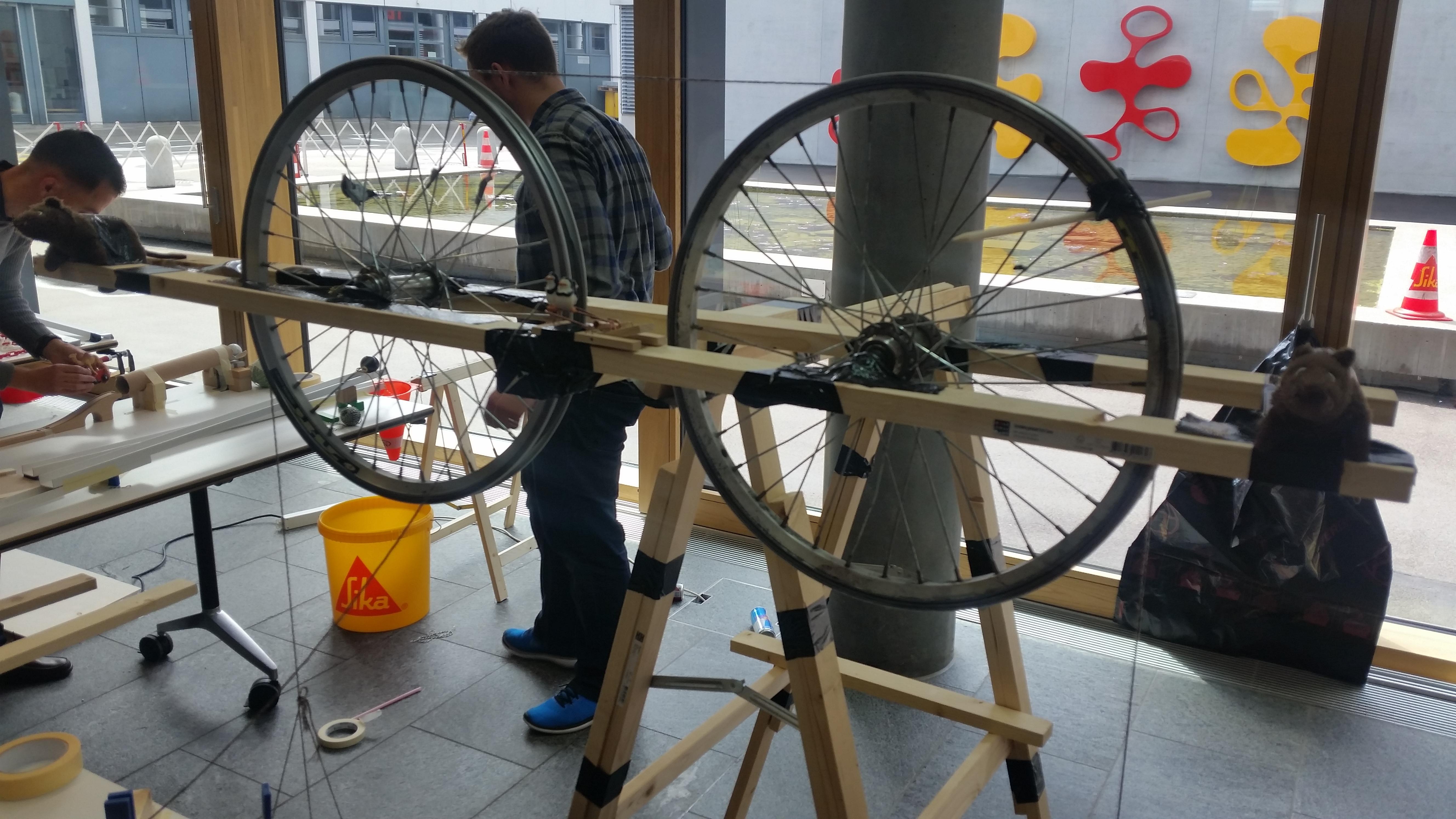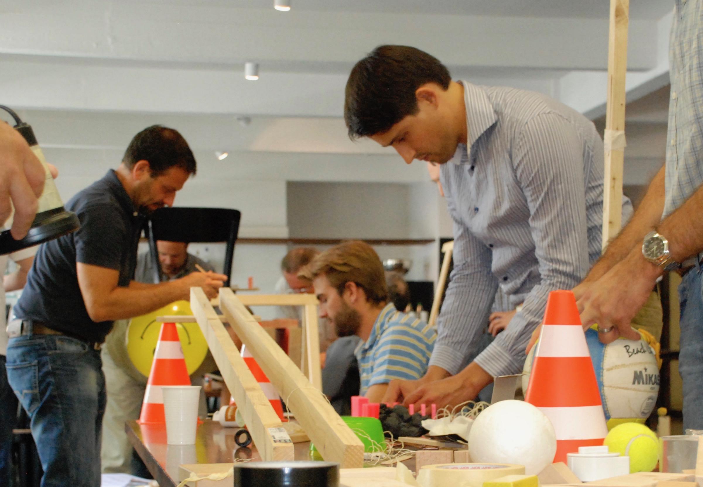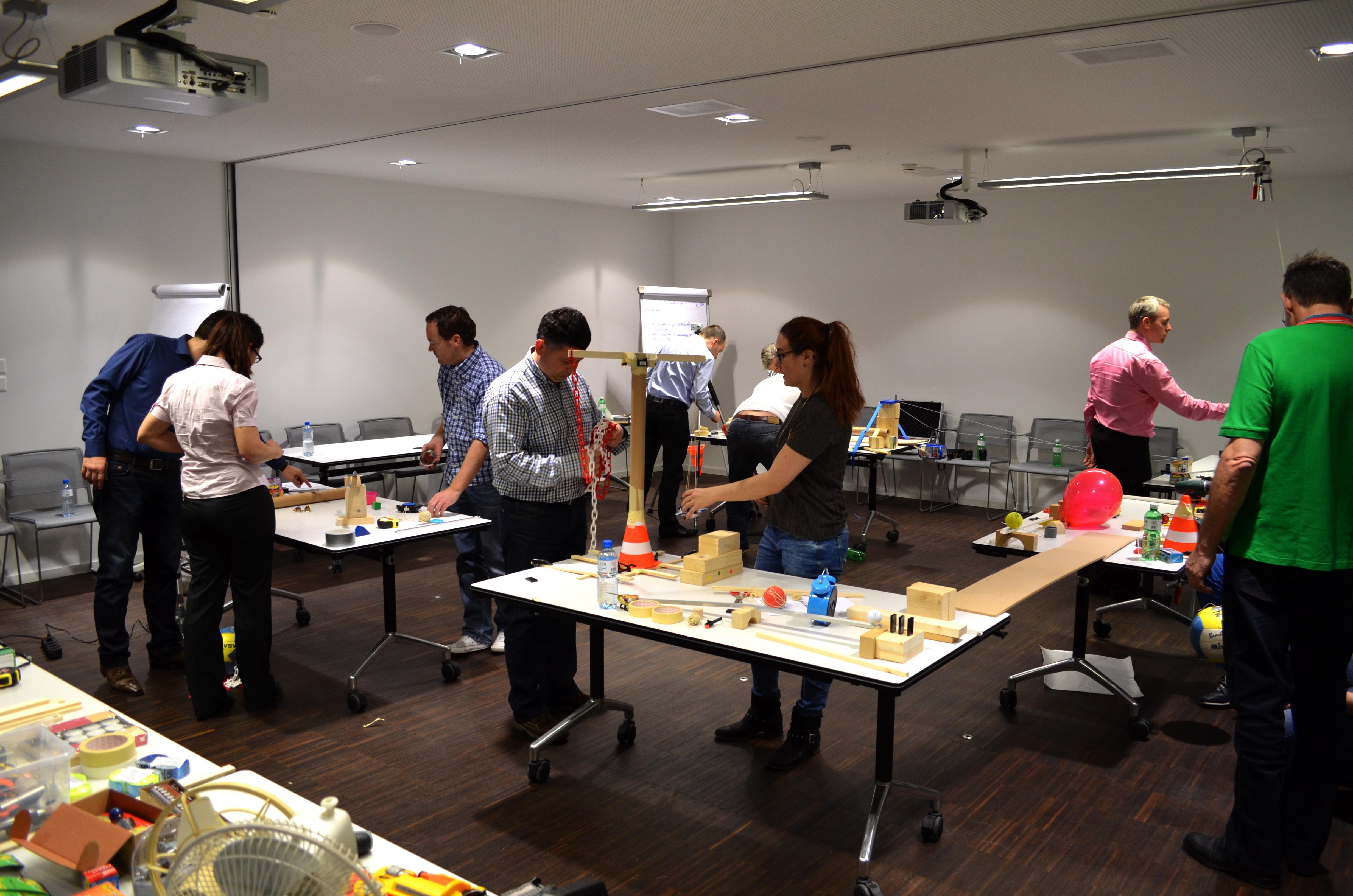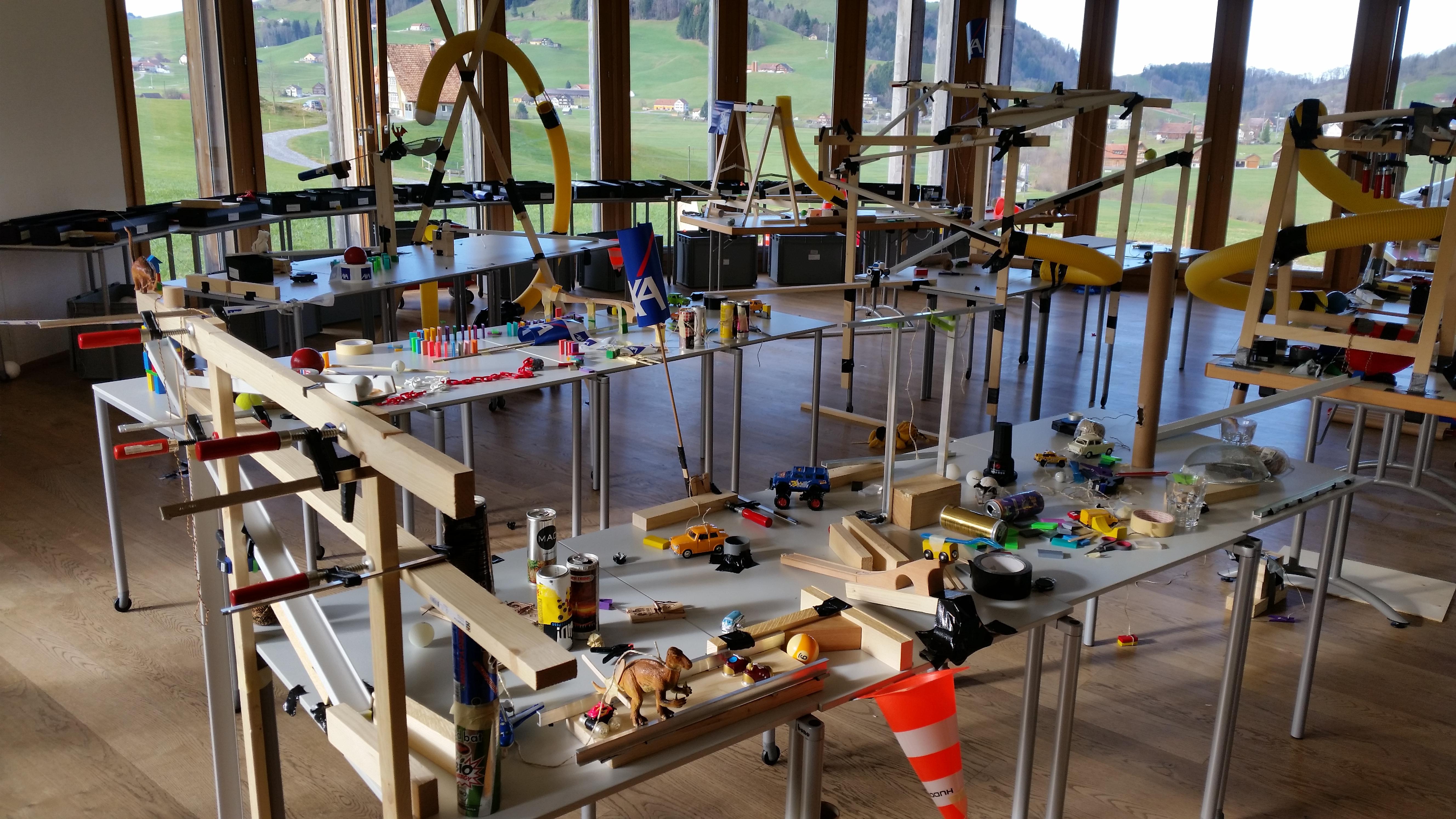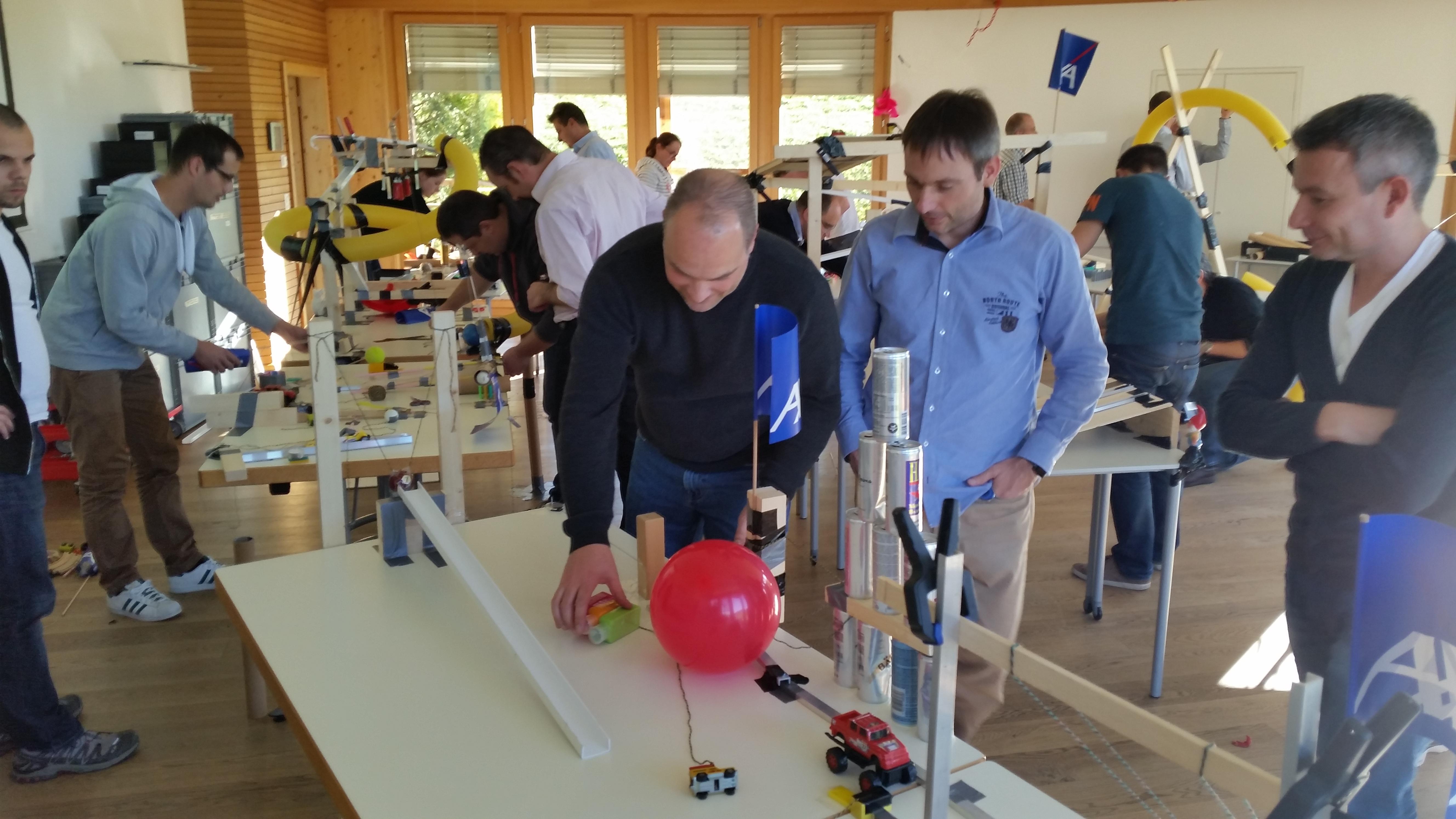 The workshop can take place wherever you like: at your company, in a seminar hotel, a production hall or even outside in good weather. We will bring along a wide variety of materials. In the course of three hours, groups of four will work together to build a section of the chain reaction. The interfaces are then discussed and built together with the two neighbouring teams. Each chain reaction has a specific task. Normally, the last group triggers a team photo of all the participants. But the chain reaction can also reveal a product or a new building, cut a ribbon at the groundbreaking ceremony, inflate a large cake at the company anniversary, and so on.
