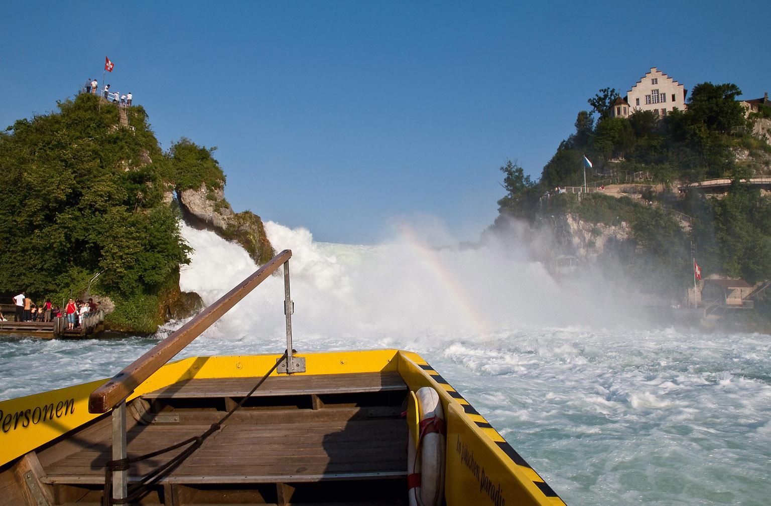 Al centro si erge una possente roccia che da millenni costringe la potenza degli elementi ed è raggiungibile con un giro panoramico sul Reno che permette di assaporare lo spettacolo naturale a distanza ravvicinata. Quasi al centro delle Cascate si può sostare anche sulle piattaforme costruite parzialmente al di sopra del Reno. Con il battello sono raggiungibili i Castelli di Wörth e di Laufen, a disposizione degli audaci c'è addirittura un noleggio di canoe.