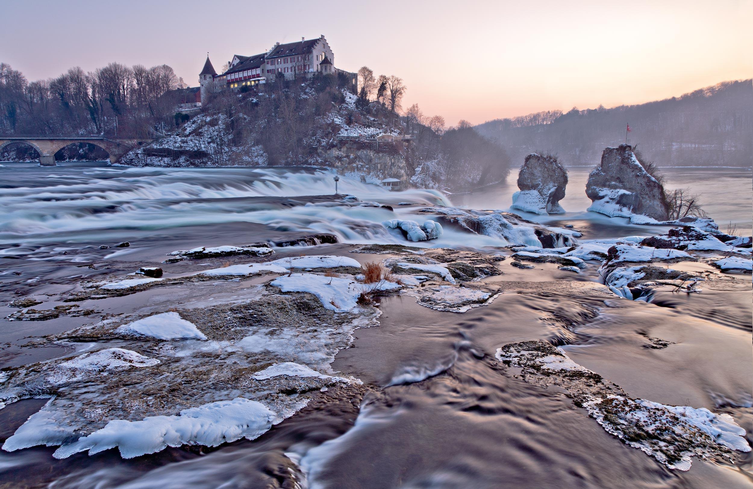 Più di 15.000 anni fa il Reno fu deviato in un nuovo letto da movimenti tettonici dell'era glaciale. Le Cascate del Reno si sono originate nel punto in cui il pietrisco friabile si sostituisce al calcare compatto. Parecchie centinaia di metri cubi d'acqua al secondo precipitano fragorosamente nel vuoto per 23 metri da un bacino della larghezza di 150 metri.