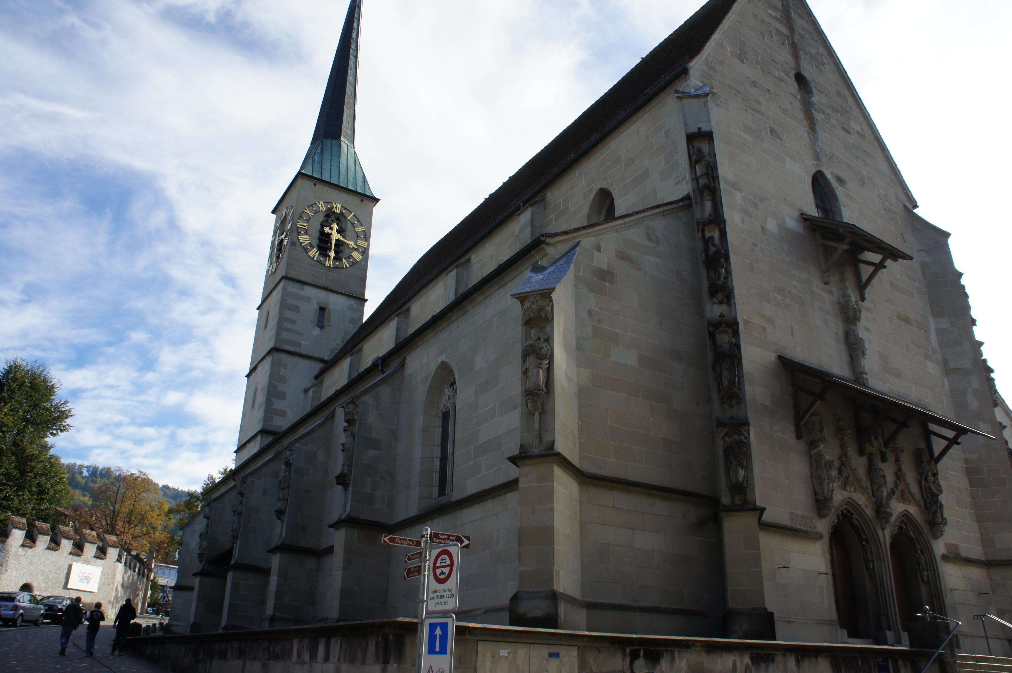 Il 18 maggio 1478, gli abitanti di Zugo, guidati da Hans Felder, gettarono le fondamenta della chiesa tardogotica. L’entrata principale è affiancata, in alto, a destra e sinistra, dai santi della città, Osvaldo e Michele.