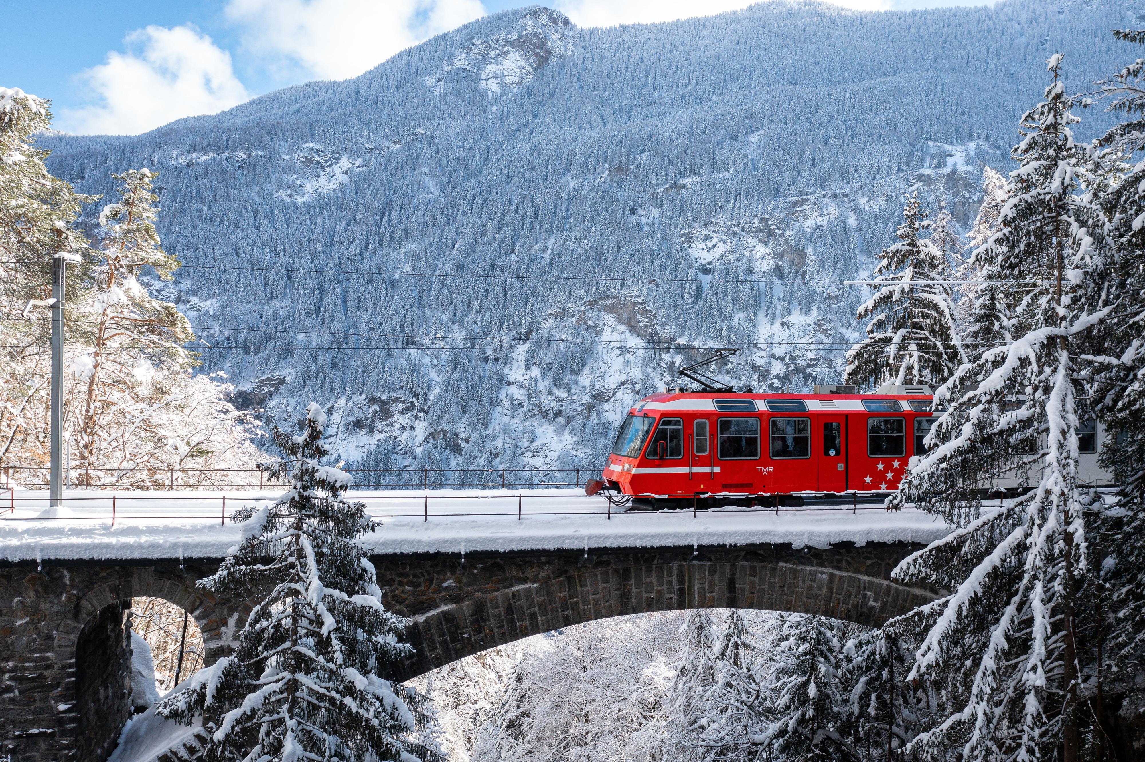 La Voie royale pour le Mont-Blanc. L'exceptionnel Express du Mont-Blanc relie Martigny dans le canton du Valais et Chamonix en France.