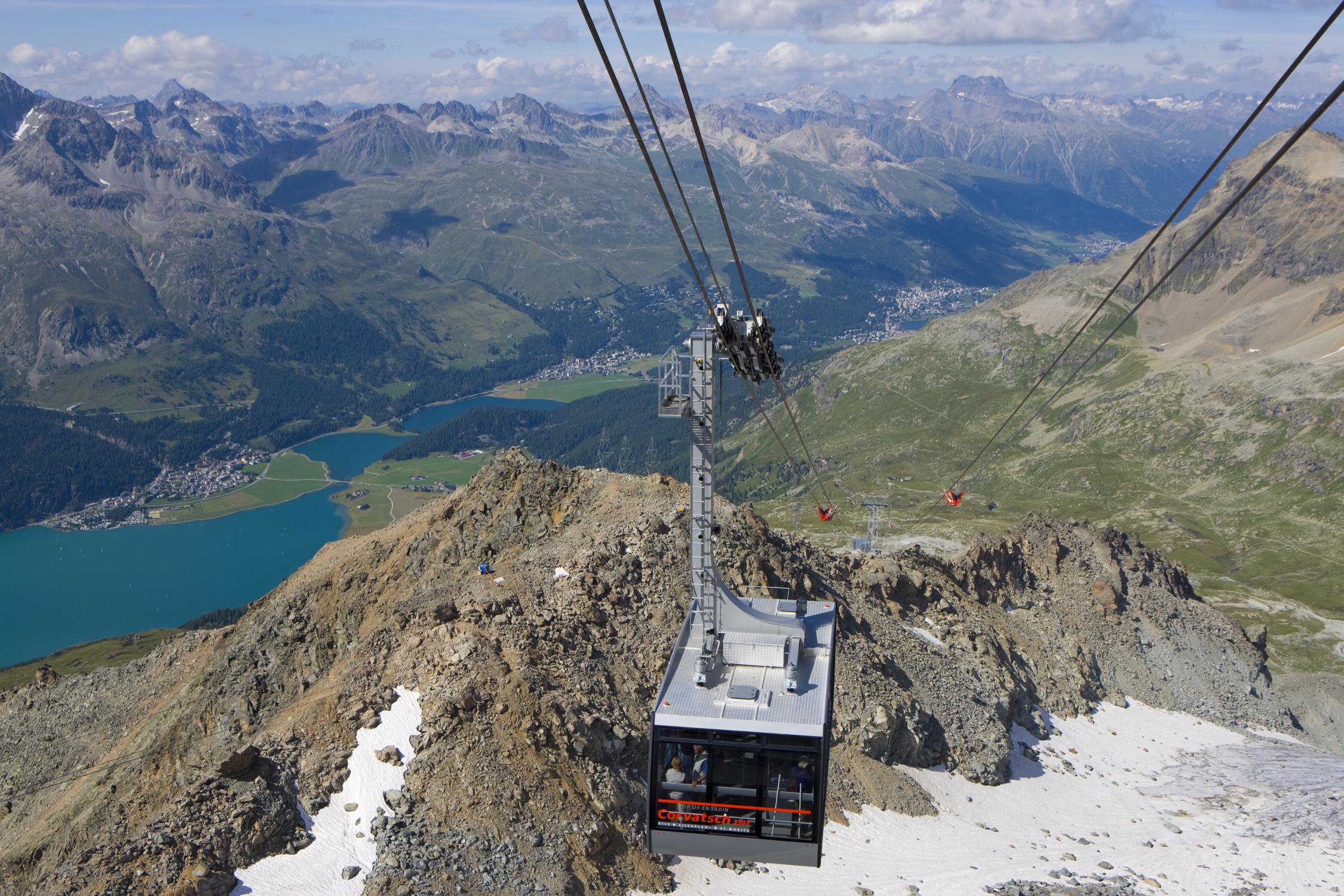 Les deux remontées mécaniques survolent les lacs bleus de Haute-Engadine à différentes altitudes, pour différentes expériences: en haute montagne sur le Corvatsch, la vue sur le Biancograt blanc du Piz Bernina; à Furtschellas, un paradis de la randonnée avec six lacs de montagne.