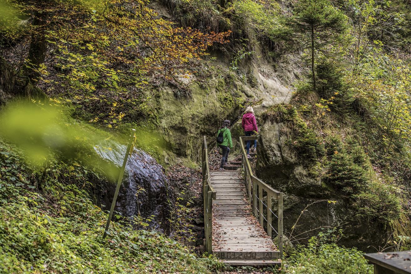 De suite après la descente près de la „Ameismühle“ on jouit déjà du calme et de l’air frais dans les gorges ombragées du Gottéron encadrées par des parois rocheuses vertigineuses et parsemées de blocs de molasse recouverts de mousse. En passant par-dessus des passerelles et des escaliers en bois solides, on arrive à la Pisciculture située à l’entrée de la vallée côté Ville de Fribourg. Tout le chemin est aménagé en sentier botanique et près de quarante arbres et buissons sont présentés avec leur noms allemands, français et latins.