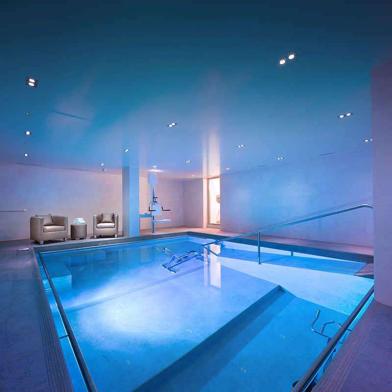 Thérapie en piscine. L’intervention en bassin thérapeutique en eau chaude permet d’opérer une réhabilitation plus précoce. L’aquathérapie nous permet ainsi d’impliquer nos patients dans un traitement actif avec des programmes d’exercices personnalisés et des programmes de physiothérapie classique au sein même de la Clinique.
