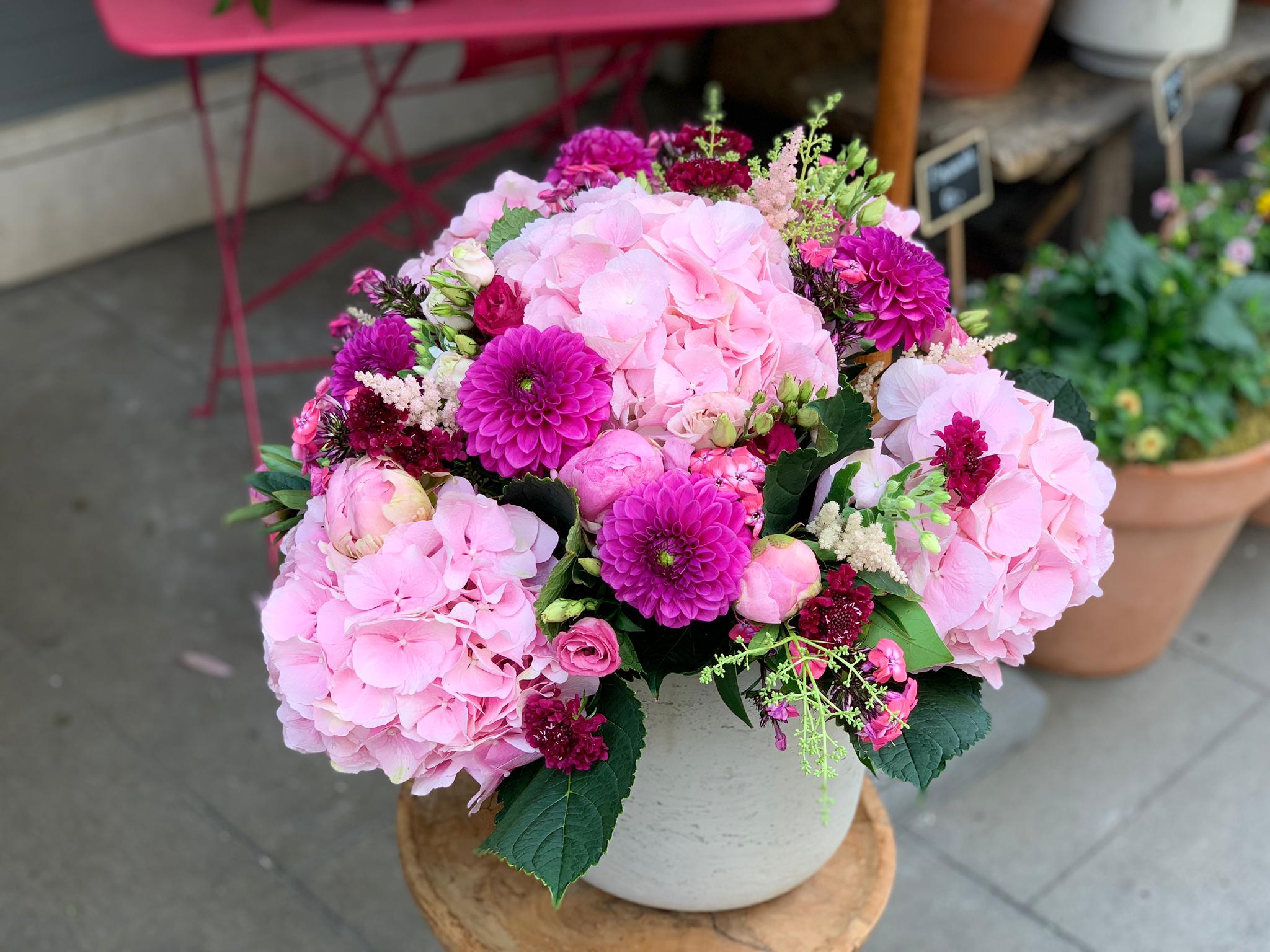 Un an plus tard, la boutique s’agrandit, mais la magie reste la même : qualité des fleurs et des plantes, originalité des compositions et création sur mesure. Pierre Mugnier met en scène des brassées de roses sublimes – sa fleur signature – mais également des callas, des orchidées, des pivoines, des renoncules du Japon et mille autres fleurs qu’il transforme en œuvres d’art éphémères, épurées ou romantiques, mais toujours majestueuses