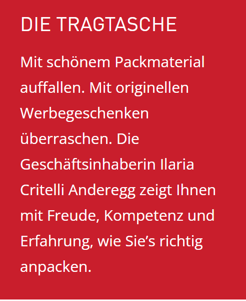 DIETRAGTASCHE AG stellt ihre Markterfahrung mit Begeisterung in den Dienst der Kunden. Wir blicken auf mehrere Jahrzehnte an Fachwissen und Erfahrung zurück. In der schnelllebigen Werbeindustrie sind diese spezifischen Kenntnisse ein wertvolles Kapital, von dem Sie während Ihrer Zusammenarbeit mit uns profitieren. Gemeinsam und in Anlehnung an Ihr Budget erarbeiten wir Ihren individuellen und nachhaltigen Auftritt.